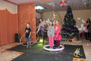 Для детей была подготовлена поздравительная программа, в которую вошли: показ небольшого видеофильма, исполнение рождественских колядок и стихов, а также шоу гигантских мыльных пузырей Светланы Завгородней.